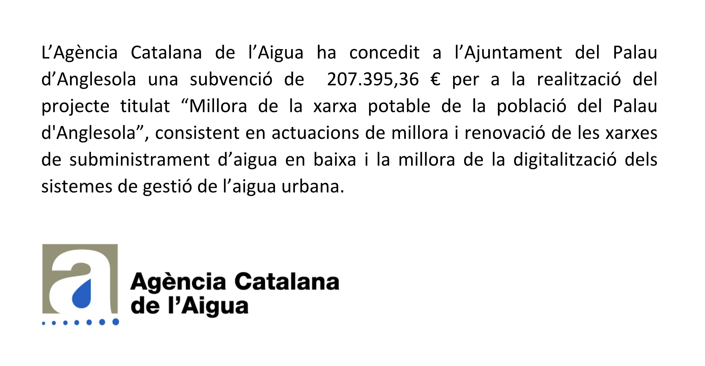 L’Agència Catalana de l’Aigua ha concedit a l’Ajuntament del Palau d’Anglesola una subvenció de 207.395,36 € per a la realització del projecte titulat “Millora de la xarxa potable de la població del Palau d’Anglesola”, consistent en actuacions de millora i renovació de les xarxes de subministrament d’aigua en baixa i la millora de la digitalització dels sistemes de gestió de l’aigua urbana.