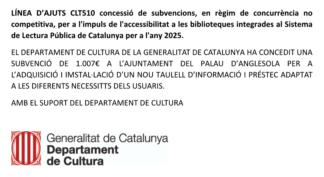 El Departament de Cultura de la Generalitat de Catalunya ha concedit una subvenció de 1.007 € a l’Ajuntament del Palau d’Anglesola per a l’adquisició i instal·lació d’un nou taulell d’informació i prèstec adaptat a les diferents necessitats dels usuaris.