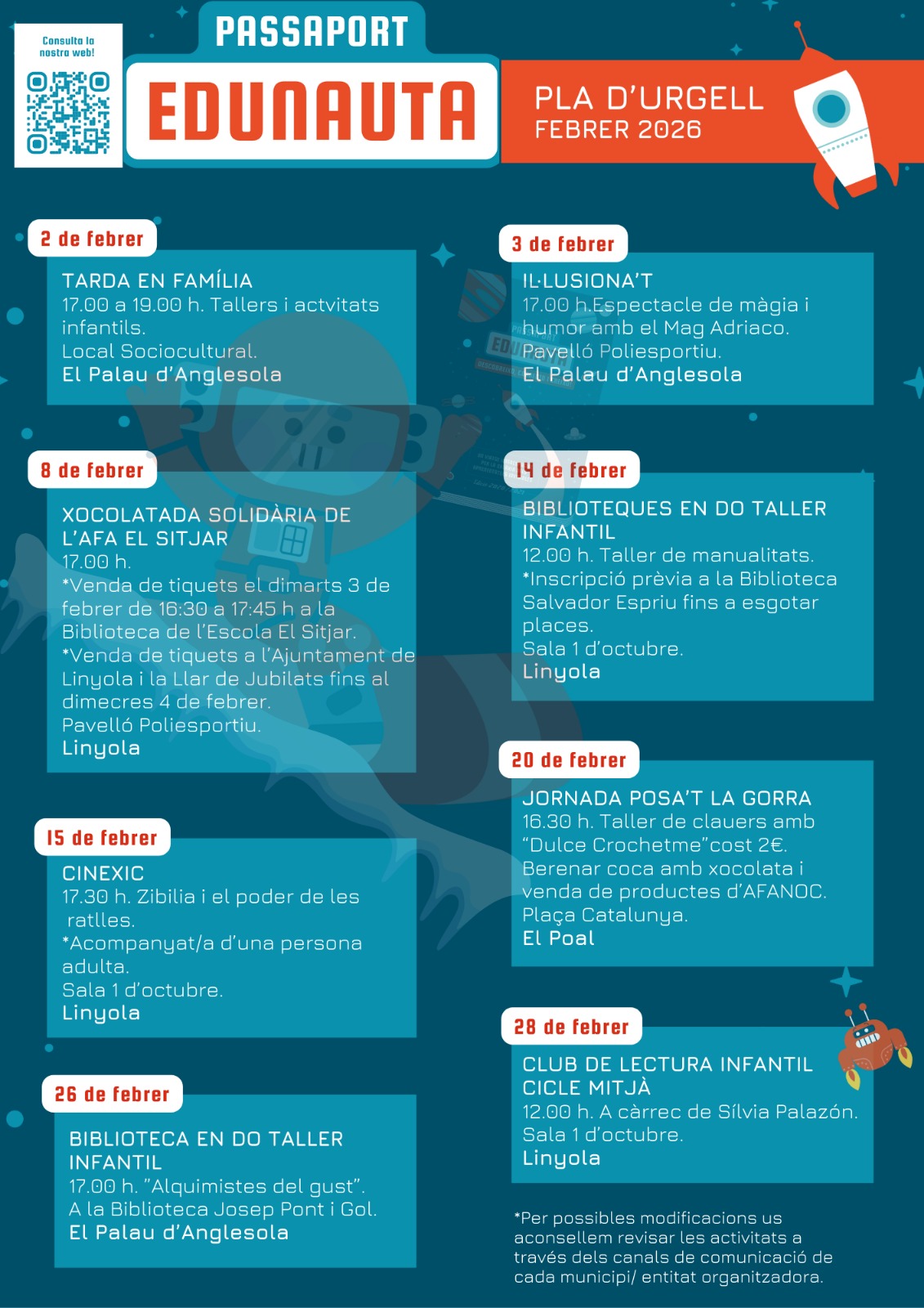 Calendari febrer 2026 al Pla d’Urgell del Passaport Edunauta